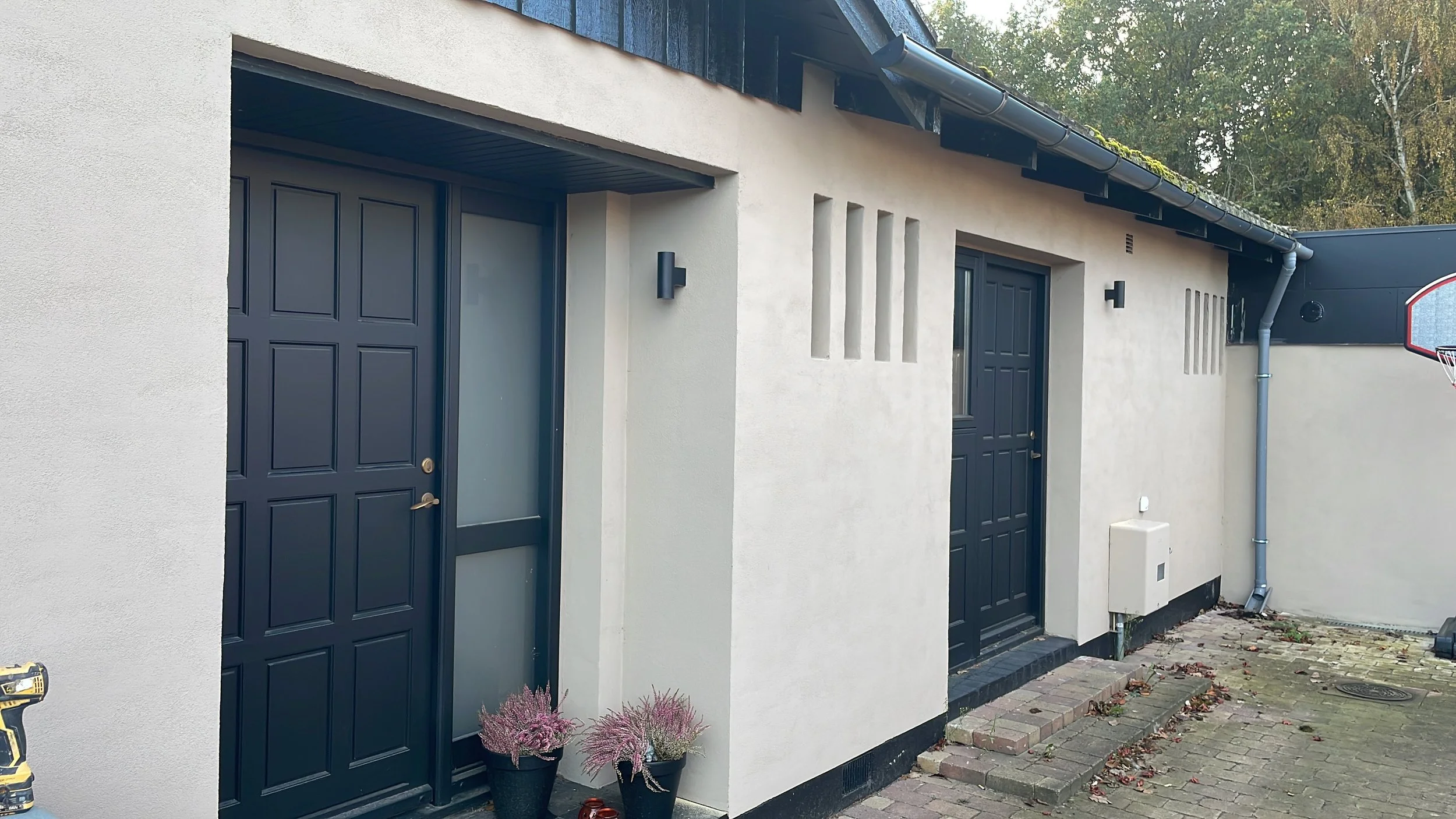Logo for Kramhöft Byg & Design featuring a stylized house outline with orange circles and lines